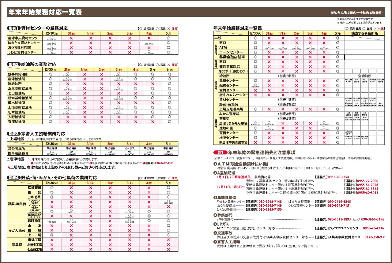 令和8年度年末年始の事業所別業務対応一覧を作成しました。